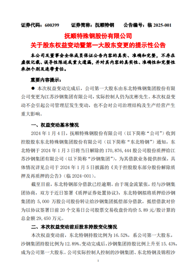 1月14日,撫順特鋼發布了《撫順特殊鋼股份有限公司 關于股東權益變動暨第一大股東變更的提示性公告》。