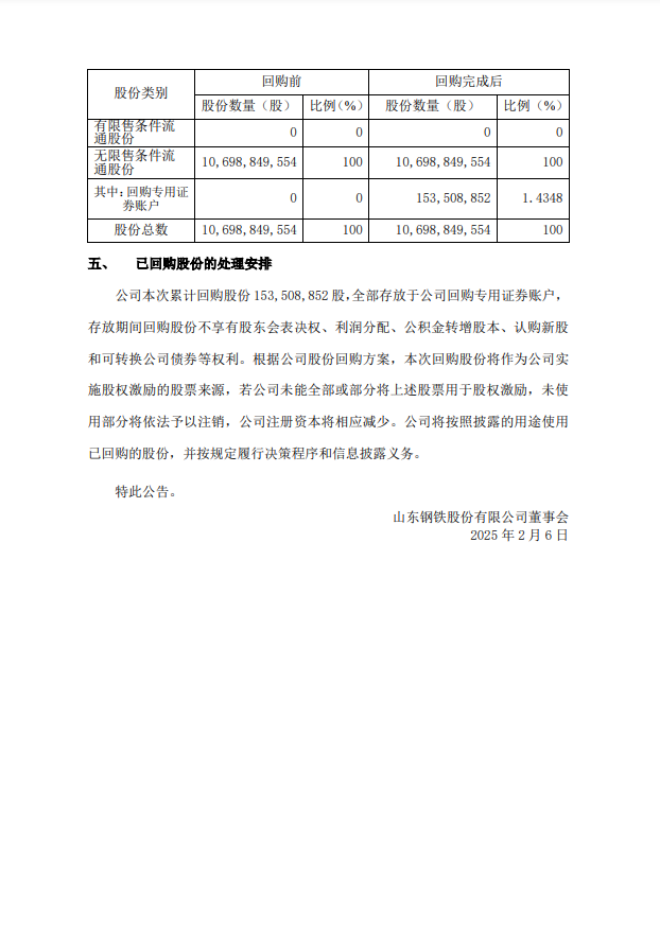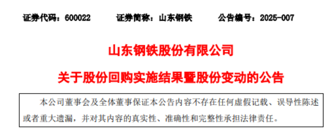 2月6日,山東鋼鐵發布了《山東鋼鐵股份有限公司關于股份回購實施結果暨股份變動的公告》(以下簡稱《公告》)。