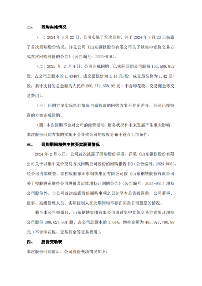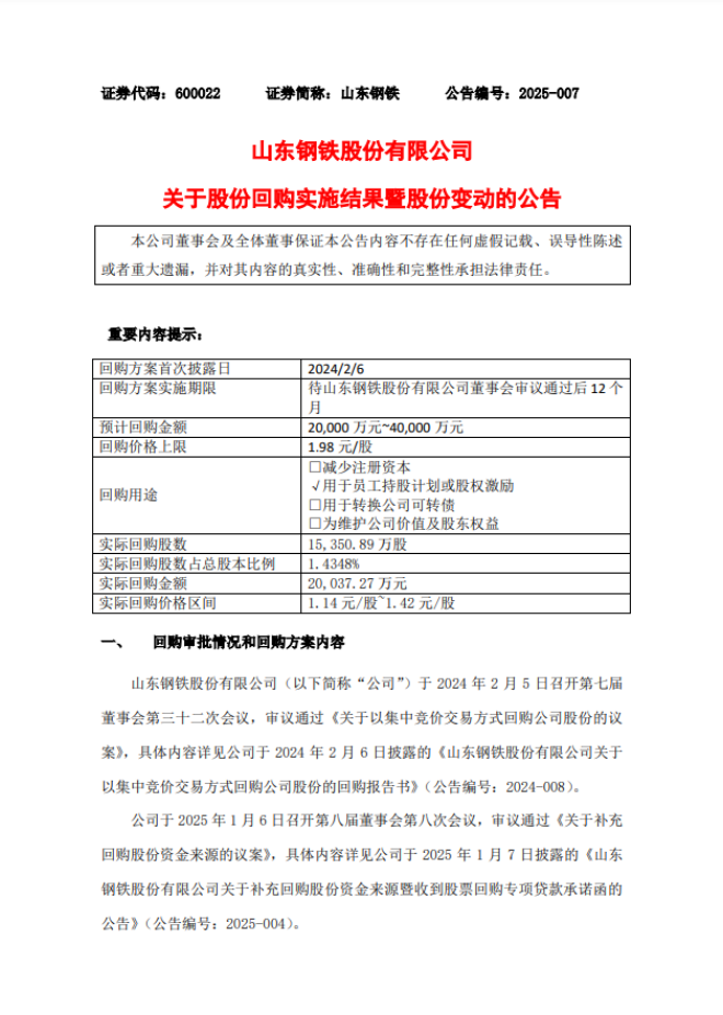 從《公告》中獲悉,山東鋼鐵股份有限公司于2024年2月5日召開第七屆董事會第三十二次會議審議通過回購股份議案,于2025年1月6日召開第八屆董事會第八次會議補充回購股份資金來源。2024年3月22日施行首次回購,2025年2月4日完成回購,實際回購公司股份1.54億股,占總股本的1.4348%,成交最低價為1.14元/股,最高價為1.42元/股,總金額為2億元。回購期間除控股股東增持外,董事等相關主體無買賣公司股票的情況。本次回購股份存于專用賬戶,將用于股權激勵,未用部分將依法注銷。