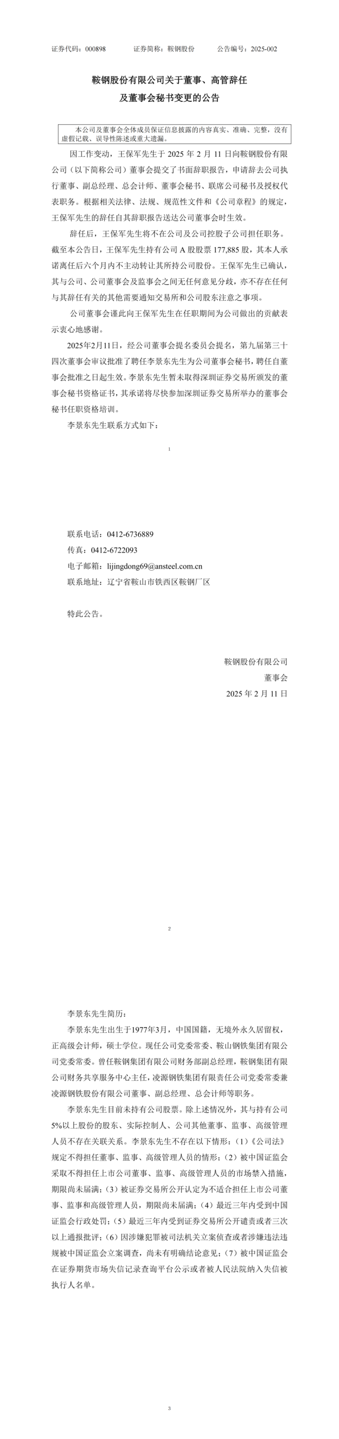 其中顯示,因工作變動,王保軍先生于2025年2月11日向鞍鋼股份有限公司(以下簡稱“公司”)董事會提交了書面辭職報告,申請辭去公司執行董事、副總經理、總會計師、董事會秘書、聯席公司秘書及授權代表職務。根據相關法律、法規、規范性文件和《公司章程》的規定,王保軍先生的辭任自其辭職報告送達公司董事會時生效。辭任后,王保軍先生將不在公司及公司控股子公司擔任職務。