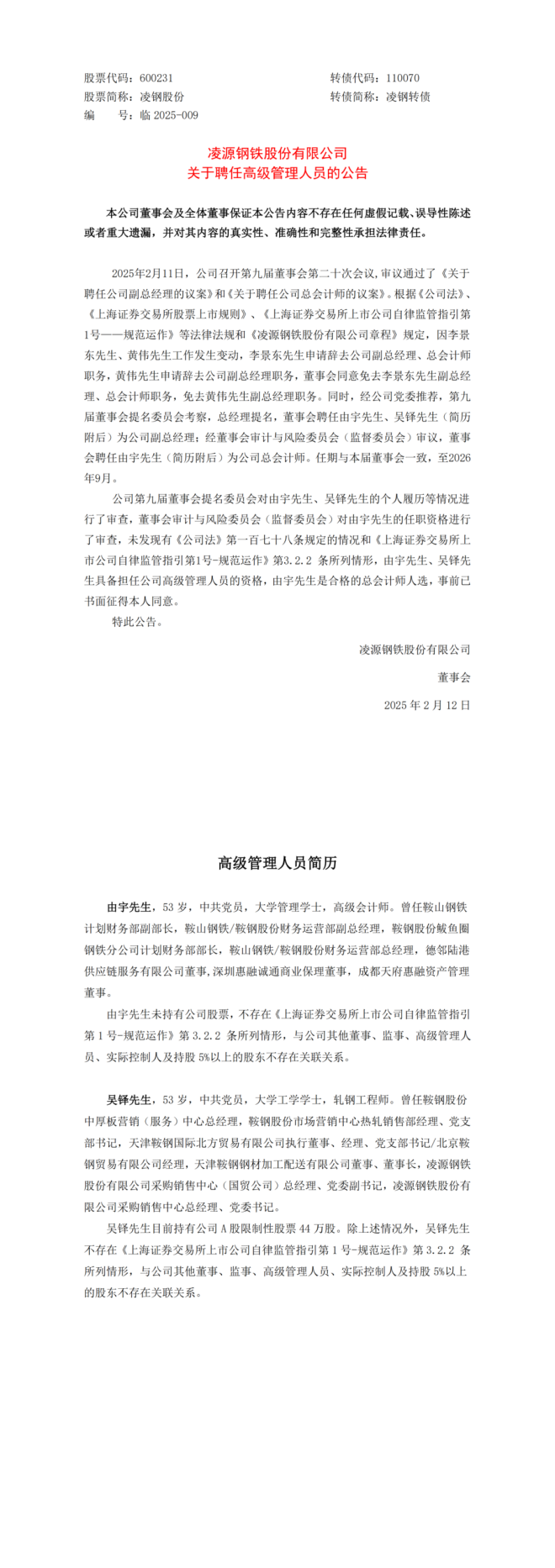 2月12日,凌鋼股份發布《關于聘任高級管理人員的公告》。