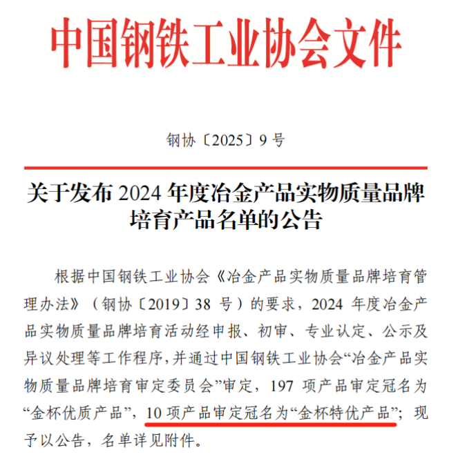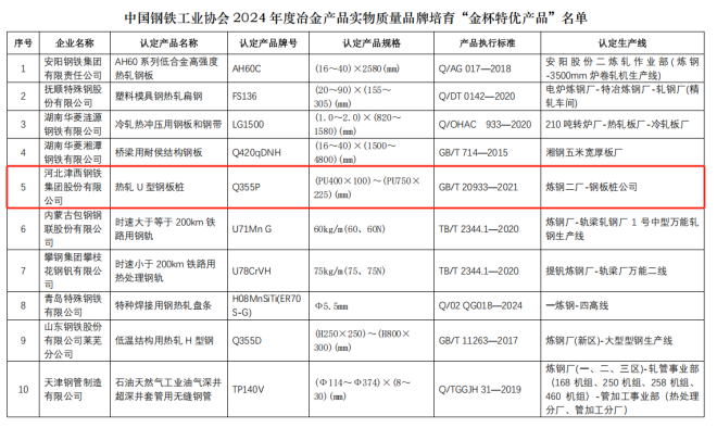 近日,中國鋼鐵工業(yè)協(xié)會官網(wǎng)發(fā)布《關(guān)于發(fā)布 2024 年度冶金產(chǎn)品實物質(zhì)量品牌培育產(chǎn)品名單的公告》。經(jīng)過冶金產(chǎn)品實物質(zhì)量品牌培育活動的申報、初審、專業(yè)認(rèn)定、公示等程序,并通過中國鋼鐵工業(yè)協(xié)會“冶金產(chǎn)品實物質(zhì)量品牌培育審定委員會”審定,10 項產(chǎn)品審定冠名為“金杯特優(yōu)產(chǎn)品”。津西熱軋U型鋼板樁產(chǎn)品獲審定冠名為“金杯特優(yōu)產(chǎn)品”。