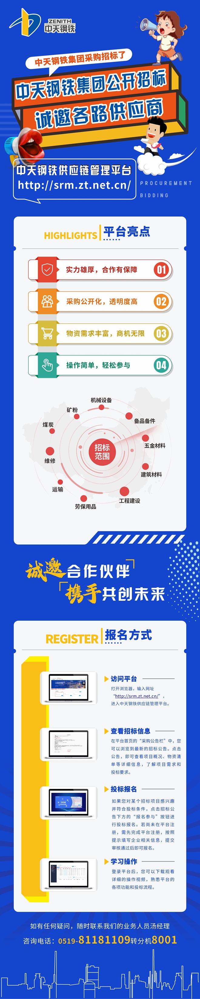 近日,中天鋼鐵集團(tuán)正式啟動(dòng)物資采購(gòu)公開(kāi)招標(biāo),依托“中天鋼鐵供應(yīng)鏈管理平臺(tái)(http://srm.zt.net.cn/)”,向全社會(huì)發(fā)出“英雄帖”,誠(chéng)邀資質(zhì)齊全、信譽(yù)良好的供應(yīng)商伙伴加入,攜手打造鋼鐵行業(yè)的優(yōu)質(zhì)供應(yīng)鏈,共同鑄就輝煌未來(lái)。
