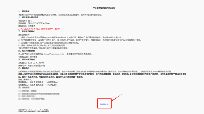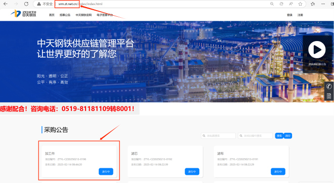 為了進(jìn)一步提升廣大供應(yīng)商的參與便捷度,集團(tuán)不斷簡(jiǎn)化“中天鋼鐵供應(yīng)鏈管理平臺(tái)”的操作流程。供應(yīng)商通過(guò)瀏覽器訪問(wèn)“http://srm.zt.net.cn/”網(wǎng)址,即可查看“采購(gòu)公告欄”中的招標(biāo)項(xiàng)目詳情,并自由選擇感興趣的項(xiàng)目報(bào)名。平臺(tái)提供清晰的報(bào)名提示和操作指南,以及一對(duì)一的專(zhuān)業(yè)指導(dǎo),幫助新供應(yīng)商快速熟悉流程,順利開(kāi)始合作。