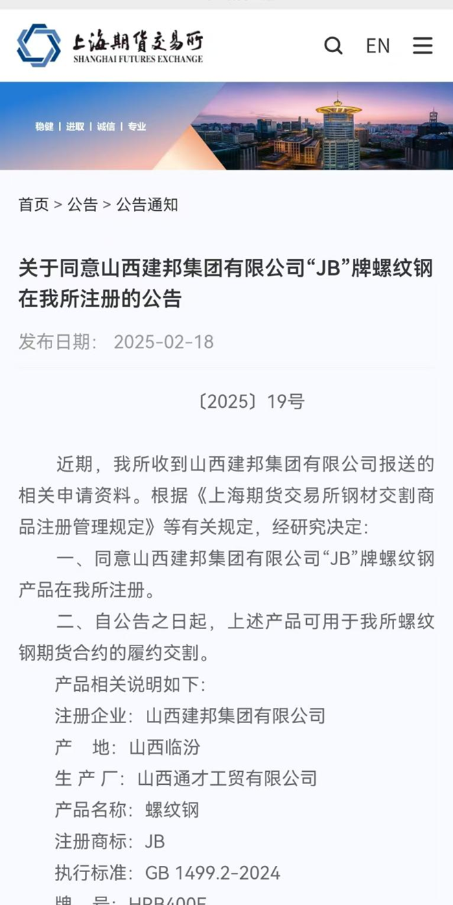 2月18日,上海期貨交易所(以下簡稱上期所)發布公告,正式同意山西建邦集團有限公司(以下簡稱建邦集團)“JB”牌螺紋鋼產品在上期所注冊,自公告之日起,該產品可正式用于上期所螺紋鋼期貨合約的履約交割。這一重大突破,標志著建邦集團螺紋鋼正式踏入期貨市場,在黑色金屬期貨領域擁有了舉足輕重的地位,是建邦集團發展歷程中一座耀眼的里程碑。