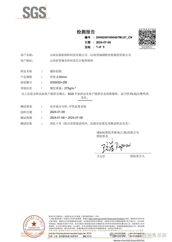 晉鋼鋅鋁鎂通過權威機構SGS第三方鹽霧試驗6000小時測試,為晉鋼鋅鋁鎂產品應用于實地環境提供了有力的事實依據。應用于此項目可以正常出具30年使用壽命的質保,得到了項目方的認可。