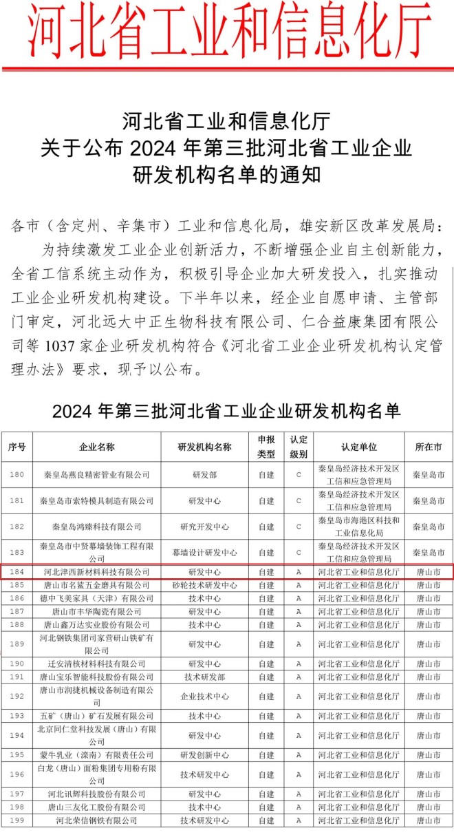 近日,河北省工業(yè)和信息化廳發(fā)布《關(guān)于公布2024年第三批河北省工業(yè)企業(yè)研發(fā)機(jī)構(gòu)名單的通知》,津西新材料通過(guò)河北省工業(yè)企業(yè)研發(fā)機(jī)構(gòu)A級(jí)認(rèn)定,這標(biāo)志著津西新材料在裝配式建筑、綠色鋼結(jié)構(gòu)、固廢綜合利用等領(lǐng)域技術(shù)研發(fā)能力得到高度認(rèn)可。