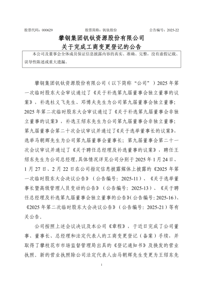 2月27日,釩鈦股份發布《關于完成工商變更登記的公告》。