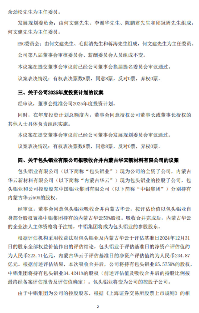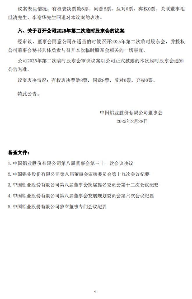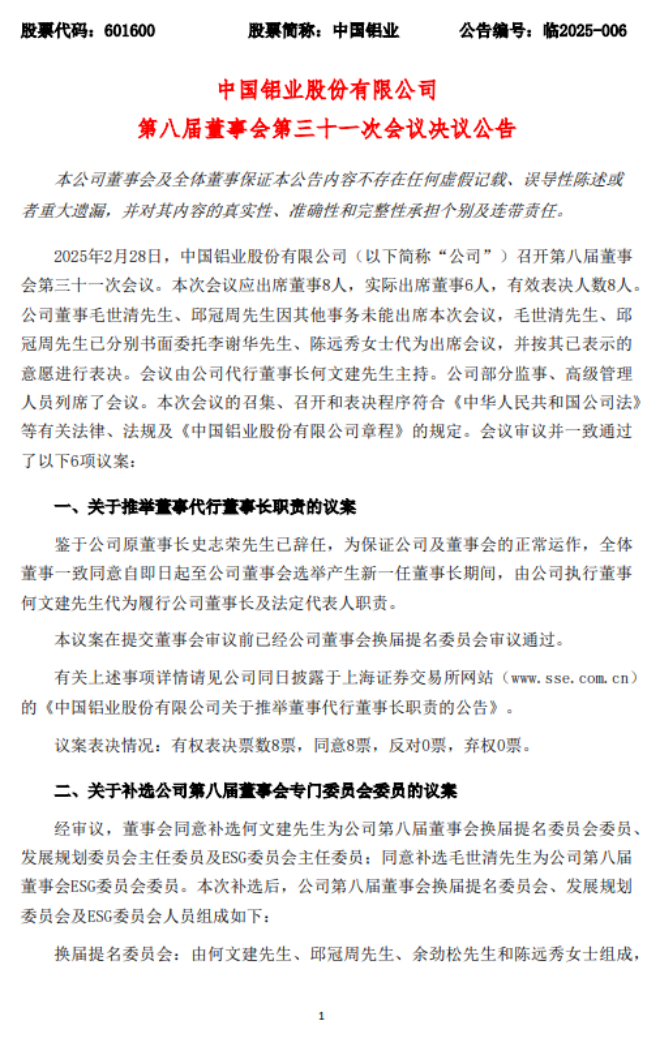 2月28日,中國鋁業(yè)發(fā)布了《中國鋁業(yè)股份有限公司第八屆董事會第三十一次會議決議公告》(以下簡稱《公告》)。
