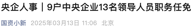 3月13日,國資小新發布文章《央企人事|9戶中央企業13名領導人員職務任免》。