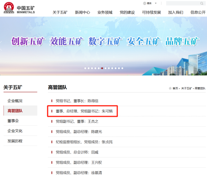 3月14日,五礦集團官網顯示,朱可炳現已擔任中國五礦董事、總經理、黨組副書記。此前,朱可炳擔任中國五礦黨組成員、副總經理,中國鹽湖工業集團有限公司董事長。
