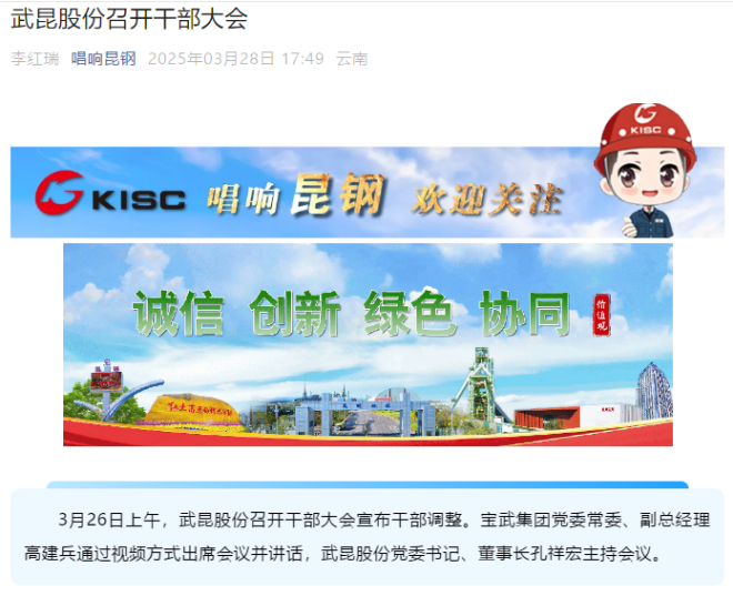 3月28日,唱響昆鋼公眾號發布了《武昆股份召開干部大會》。