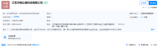 據天眼查顯示,2025年4月3日,江蘇沙鋼云商科技有限公司成立,法定代表人為徐亮前,注冊資本為1000萬人民幣。該公司位于江蘇省蘇州市,是一家以從事互聯網和相關服務為主的企業。