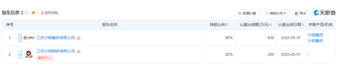 該公司由江蘇沙鋼集團有限公司持股80%,江蘇沙鋼鋼鐵有限公司持股20%。