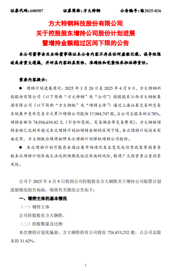 4月10日,方大特鋼發(fā)布了《方大特鋼科技股份有限公司關(guān)于控股股東增持公司股份計(jì)劃進(jìn)展暨增持金額超過(guò)區(qū)間下限的公告》(以下簡(jiǎn)稱《公告》)。