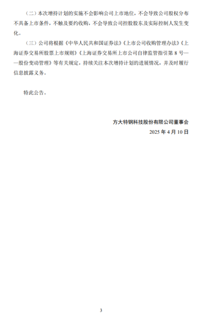 從《公告》中獲悉,控股股東方大鋼鐵于2025年3月20日至2025年4月9日,通過(guò)集中競(jìng)價(jià)交易方式增持公司股份1798萬(wàn)股,占公司總股本的0.78%,增持金額為7494萬(wàn)元,增持金額已達(dá)到并超過(guò)本次增持計(jì)劃擬增持金額的區(qū)間下限,增持計(jì)劃尚未實(shí)施完畢。