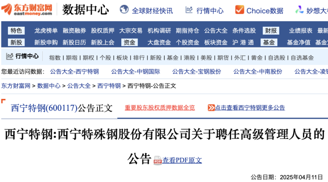 4月11日,西寧特鋼發(fā)布《關(guān)于聘任高級(jí)管理人員的公告》。