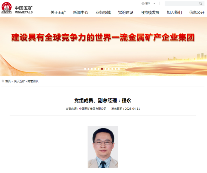 4月11日,中國五礦集團官網(wǎng)顯示,該集團高管團隊發(fā)生變動:程永已擔任中國五礦黨組成員、副總經(jīng)理。