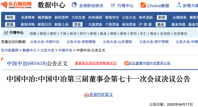 4月17日,中國(guó)冶金科工股份有限公司(以下簡(jiǎn)稱(chēng)“該公司”)發(fā)布兩篇公告,其中顯示,該公司于4月16日召開(kāi)第三屆董事會(huì)第七十一次會(huì)議。