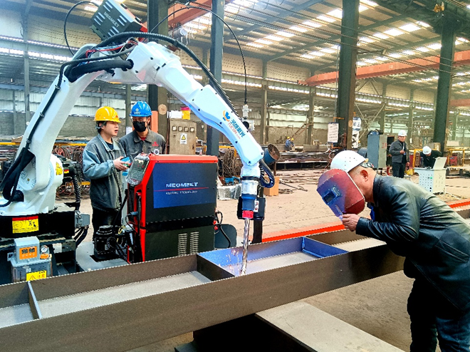 ▲與會代表仔細考察筋板機器人自動焊接設備