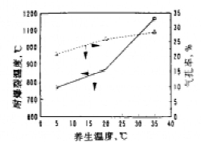 由以上爆裂機理可以看出,影響材料防爆性能的因素主要有材料的透氣性和材料本身的強度。對于高爐爐身中上部而言,一般采用水泥作為材料的結合劑,在水泥水化的過程中,其養生溫度對水化產物及材料的氣孔率都有較大的影響,實驗結果如下圖所示。