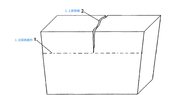 目前撇渣器大多采用預制模塊化設計,采用ASC材料體系已成共識,但是撇渣器的結構化設計仍有許多改進之處。預制撇渣器過梁在使用過程中特別容易發生中間縱向開裂進而發生漏渣過渣問題。發生開裂的原因主要是過梁的下部浸泡在溫度高達1450℃左右高溫鐵水中,耐火材料發生較大的熱膨脹,而上部有約1/3~1/5高度則裸在空氣中處于較低溫度,上表面溫度一般只有300℃左右,其線性膨脹量顯然遠小于過梁的下部。因此開裂一般從上部開始,一般在除鐵后2~3爐即已經出現,并逐步擴大向下延伸如下圖所示: