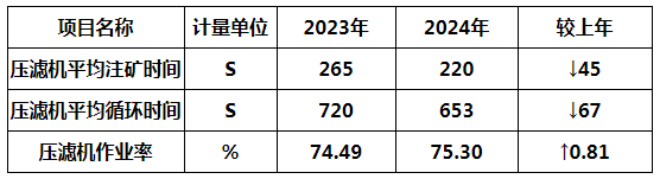 改善注礦方式、優化注礦頻率、提高助濾劑添加精準度,壓濾機注礦效率提升 17 %;壓濾機循環效率提升 9.31 %;壓濾機作業率提升0.81%。