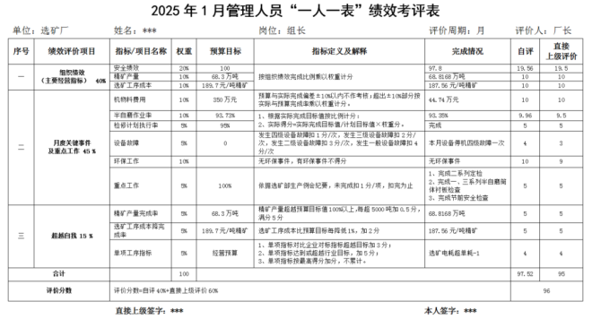 構建以“一人一表”為載體的強績效管理體系,實現精細化、精準化、極致化。全員、全工序、全覆蓋編制全體員工“一人一表”績效責任書,形成科學的“一人一表”強績效評價機制,并按月進行評價。