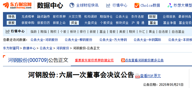 5月21日,河鋼股份發布了《河鋼股份:六屆一次董事會決議公告》(以下簡稱《公告》)。