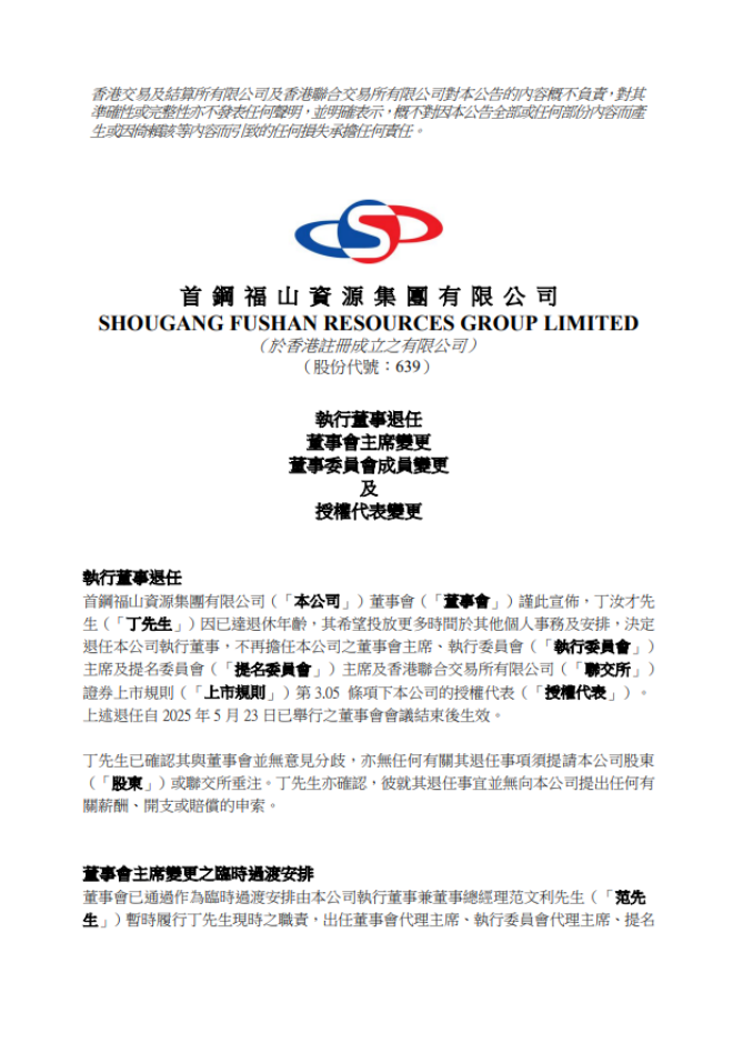 5月23日,首鋼福山資源集團有限公司發布了《執行董事退任、董事會主席變更、董事委員會成員變更及授權代表變更》公告。