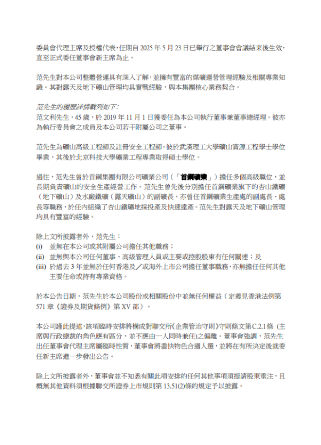 董事會已通過作為臨時過渡安排由本公司執行董事兼董事總經理范文利先生暫時履行丁先生現時之職責,出任董事會代理主席、執行委員會代理主席、提名委員會代理主席及授權代表,任期自2025 年5月23日已舉行之董事會會議結束后生效,直至正式委任董事會新主席為止。