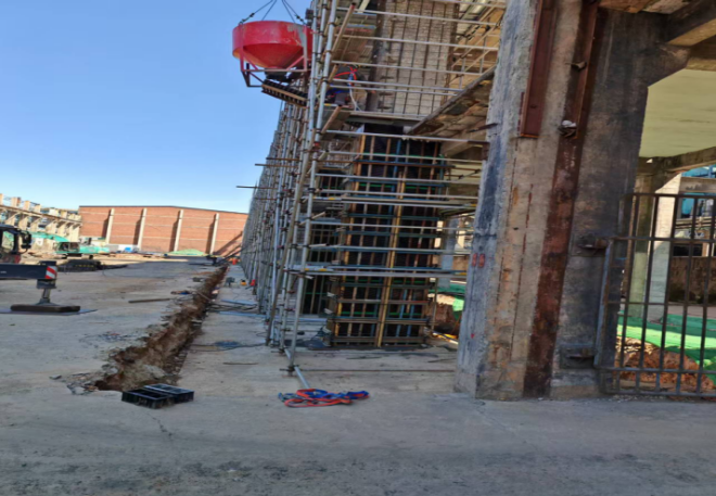 灌漿料加固施工時,對所要加固的基礎部位進行剔鑿,露出原有的鋼筋,再根據所要加固部位的厚度,進行鋼筋綁筋,將其與原有的鋼筋焊接在一起。支模后,利用輸送泵將流動漿料灌注到固定的部位,灌漿完成后24小時拆模,進行灑水養護7天,28后達到工程設計要求。經過大量實驗證明,加固好的柱體,灌漿料與原有的界面粘接牢固,不易脫落,強度高。