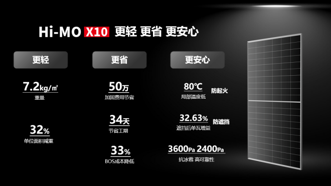Hi-MO X10憑借24.8%轉換效率(單塊功率提升140W),使BOS成本(指光伏發電系統中除組件外的所有配套設備及工程成本)降低33%,且改造周期僅為8天—10天,遠小于常規“加固+安裝”所需42天的工期。此外,Hi-MO X10憑借強承載力和防起火、防遮擋的雙防功能,在使用上讓業主更為安心。