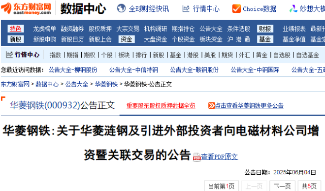 6月4日,華菱鋼鐵發(fā)布了關于華菱漣鋼及引進外部投資者向電磁材料公司增資暨關聯交易的公告(以下簡稱“公告”)。