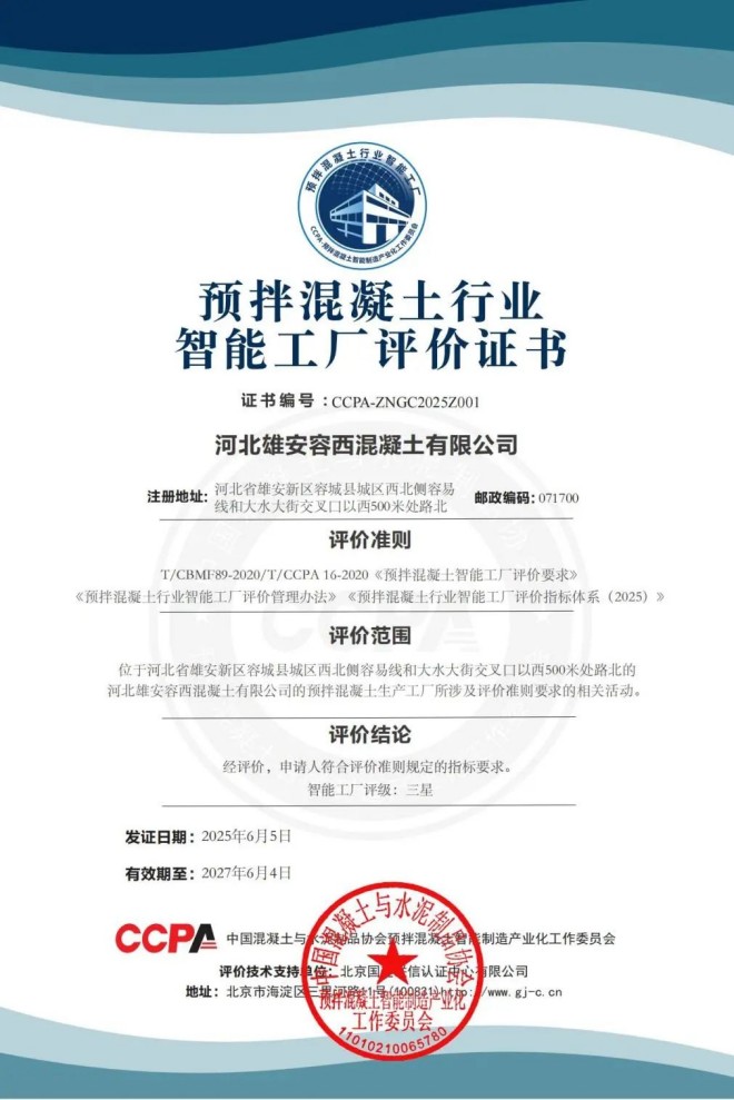 近日,中國二十二冶雄安容西混凝土攪拌站獲評中國混凝土與水泥制品協會預拌混凝土智能制造產業化工作委員會授予的"預拌混凝土行業三星級智能工廠"稱號。該榮譽系預拌混凝土行業智能化評估的最高等級認證,標志著雄安容西攪拌站成為2025年度全國首個通過此項權威認證的企業。截至目前,全國范圍內僅有3家企業成功獲評該頂級智能工廠認證。