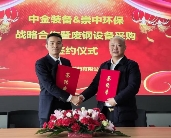 近日,長沙中金智能裝備有限公司(簡稱“中金裝備”)與湘潭崇中環保科技有限公司(簡稱“崇中環保”)正式簽署戰略合作協議,并簽訂近千萬元的成套先進創新型廢鋼加工裝備采購訂單。