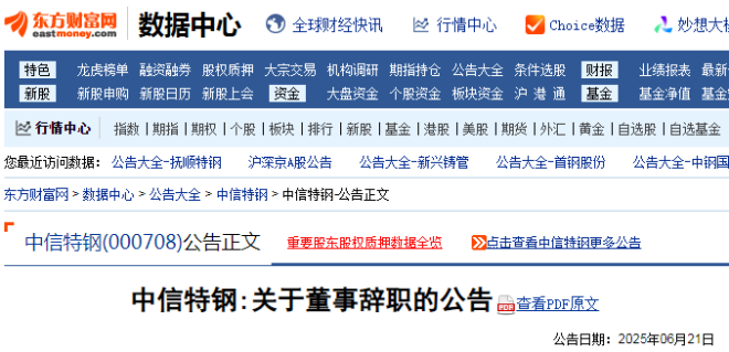 6月21日,中信特鋼發布了關于董事辭職的公告。