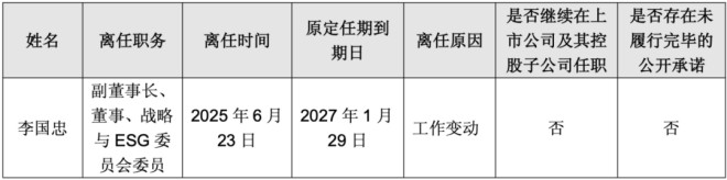 其中顯示,因工作變動(dòng),該公司董事李國(guó)忠辭去副董事長(zhǎng)、董事、戰(zhàn)略與ESG委員會(huì)委員職務(wù),離任后將不在上市公司及其控股子公司繼續(xù)任職。