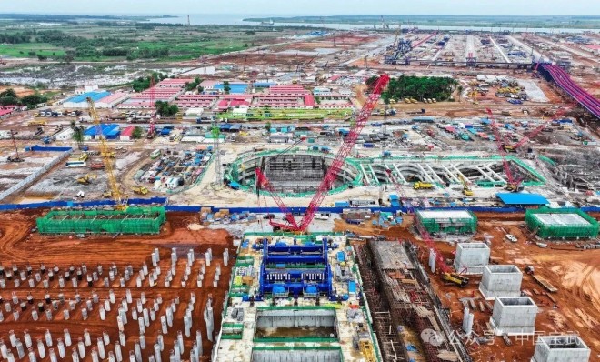 5月28日,記者在港區(qū)的制高點(diǎn),也是北部區(qū)塊港口工程的關(guān)鍵性項(xiàng)目——已封頂?shù)姆嚈C(jī)房房頂上看到,整個(gè)港區(qū)一派繁忙景象,吊機(jī)林立、施工車輛川流不息,但夜間下雨讓道路顯得有些泥濘。西芒杜港口控股公司、西芒杜港口項(xiàng)目公司物資設(shè)備部部長陳強(qiáng)告訴記者:“進(jìn)入雨季后,我們這里會(huì)一天到晚不停地下雨,室外作業(yè)基本都停了,只能進(jìn)行室內(nèi)作業(yè)。因此,各參建單位都加派人手,爭取在雨季來臨前,完成必要的室外工程施工。目前,360平方米的港區(qū)內(nèi),集聚了共7000人左右的中外施工人員。很多項(xiàng)目需要協(xié)同推進(jìn),通過現(xiàn)場精密安排和協(xié)調(diào)指揮,12項(xiàng)工程正同步進(jìn)行作業(yè)。”
