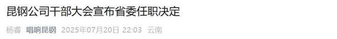 從唱響昆鋼微信公眾號獲悉,7月20日下午,云南省委組織部在昆鋼公司召開干部大會,云南省委組織部部務委員胡波宣讀省委對昆鋼干部的任職決定并提出工作要求。云南省國資委黨委副書記劉成志主持會議。