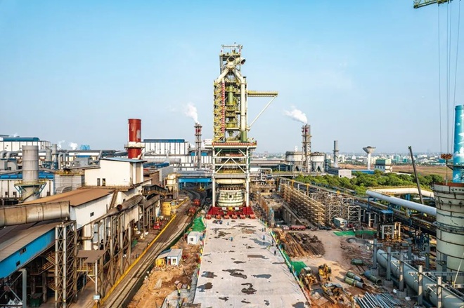 2025年,由上海寶冶承建的衢州元立1280立方米高爐項目,推出“高爐本體及框架一體化整體滾裝”技術(shù),標(biāo)志冶金工程模塊化進(jìn)入全系統(tǒng)集成新階段。該項目需拆除2座舊高爐,新建1座配套完整的1280立方米高爐。上海寶冶團(tuán)隊在工廠搭建大型預(yù)制平臺,完成該高爐本體、框架、冷卻系統(tǒng)、管道、電氣設(shè)備、爐頂設(shè)施等全系統(tǒng)集成預(yù)組裝,形成高85.7米、重3900噸的一體化模塊。該高爐運(yùn)輸與安裝采用12軸智能化SPMT模塊車(承載超4000噸)。運(yùn)輸前,該項目團(tuán)隊勘察改造路線、加固路面,制訂詳細(xì)方案;運(yùn)輸中,通過計算機(jī)系統(tǒng)實時調(diào)控車速、轉(zhuǎn)向與姿態(tài),確保平穩(wěn);現(xiàn)場安裝時,模塊車將高爐緩慢降至預(yù)設(shè)基礎(chǔ)定位裝置,全程高精度監(jiān)測調(diào)整,并創(chuàng)造了國內(nèi)外高爐運(yùn)輸與安裝高度、重量及效率的紀(jì)錄。