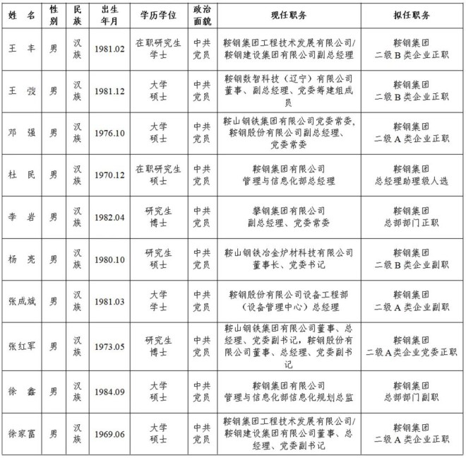 鞍鋼集團(tuán)有限公司10名擬任職領(lǐng)導(dǎo)人員名單