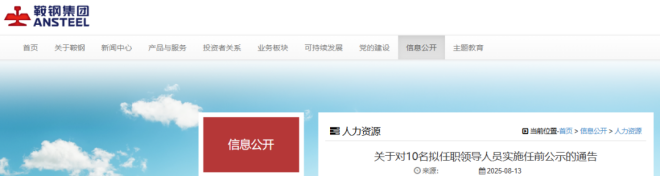 近日,鞍鋼集團(tuán)官網(wǎng)發(fā)布了《關(guān)于對(duì)10名擬任職領(lǐng)導(dǎo)人員實(shí)施任前公示的通告》(以下簡(jiǎn)稱《通告》)。