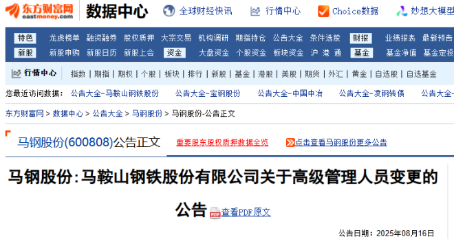 8月16日,馬鋼股份發(fā)布了《馬鞍山鋼鐵股份有限公司關(guān)于高級(jí)管理人員變更的公告》。