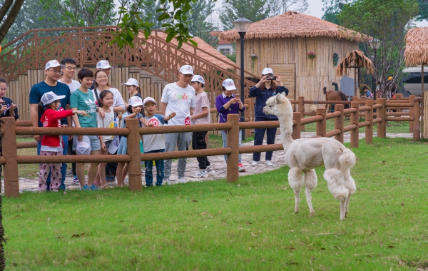 而后,大家分乘旅游觀光車,駛向生態園,與動物零距離接觸。伸手摸摸溫馴的矮馬,和萌萌的羊駝打個招呼,看小松鼠上竄下跳,都讓大家開心、興奮不已。第一次迎來這么多游客,美麗的梅花鹿略顯緊張、羞澀,它們警覺地豎起耳朵,眼見沒什么“惡意”,一會兒就放松了警惕,互相追逐起來;在草地上悠閑散步的孔雀最令大家著迷。身為鳥中之王,面對游人它們毫不怯場,自顧自地覓食。一只孔雀甚至罕見地開起屏來,昂首挺胸來回轉著,炫耀自己的美麗。