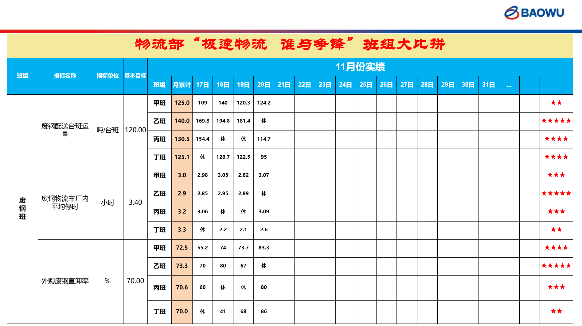 全員攻關(guān),班組比拼賽道爭(zhēng)當(dāng)“排頭兵”。物流部基層20個(gè)班組站上新賽道,設(shè)定生產(chǎn)效率、成本、安全、質(zhì)量、設(shè)備、能源環(huán)保、員工行為等61個(gè)關(guān)鍵指標(biāo),在現(xiàn)場(chǎng)電子看板上設(shè)置“‘極速物流 誰(shuí)與爭(zhēng)鋒’班組大比拼”宣傳欄,每日記載參賽單元每班(或每日)的工作實(shí)績(jī),根據(jù)班組賽道開(kāi)展情況,評(píng)選出月度“效率先鋒班組”冠軍、亞軍、季軍,同時(shí)評(píng)選出優(yōu)勝獎(jiǎng)3個(gè)、進(jìn)步獎(jiǎng)4個(gè),對(duì)評(píng)選出的“效率先鋒班組”獲獎(jiǎng)班組進(jìn)行表彰,授予“效率先鋒班組”冠亞季軍流動(dòng)紅旗,并實(shí)施月度激勵(lì)。賽道開(kāi)跑以來(lái),號(hào)召員工爭(zhēng)做優(yōu)秀團(tuán)隊(duì)、爭(zhēng)當(dāng)優(yōu)秀員工、爭(zhēng)創(chuàng)一流業(yè)績(jī),以實(shí)干實(shí)績(jī)確保活動(dòng)各項(xiàng)目標(biāo)全面實(shí)現(xiàn)。物流部還制定專屬于“極速物流 誰(shuí)與爭(zhēng)鋒”榜,激勵(lì)員工奮勇?tīng)?zhēng)先、再接再厲、戒驕戒躁,瞄準(zhǔn)新目標(biāo)再創(chuàng)新業(yè)績(jī)。全體員工以先進(jìn)為榜樣,專注崗位,勇于擔(dān)當(dāng),同心協(xié)力,對(duì)標(biāo)爭(zhēng)先,為物流部體系能力持續(xù)提升做出更大貢獻(xiàn)。