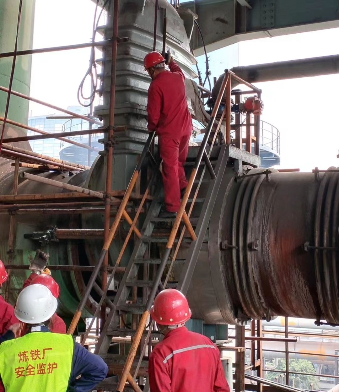 在二號高爐爐頂7樓和9樓檢修平臺,二號高爐管技人員正與中冶寶鋼人員更換上料罐上密總成以及下料罐護板,由于兩個位置在不同樓層需要同時開始更換,加上下料罐內(nèi)部還需搭架子,對團隊的協(xié)作能力和細心程度是一次極大的挑戰(zhàn)。