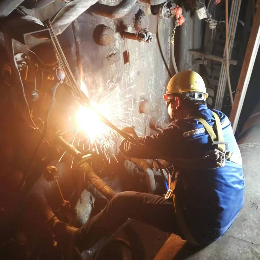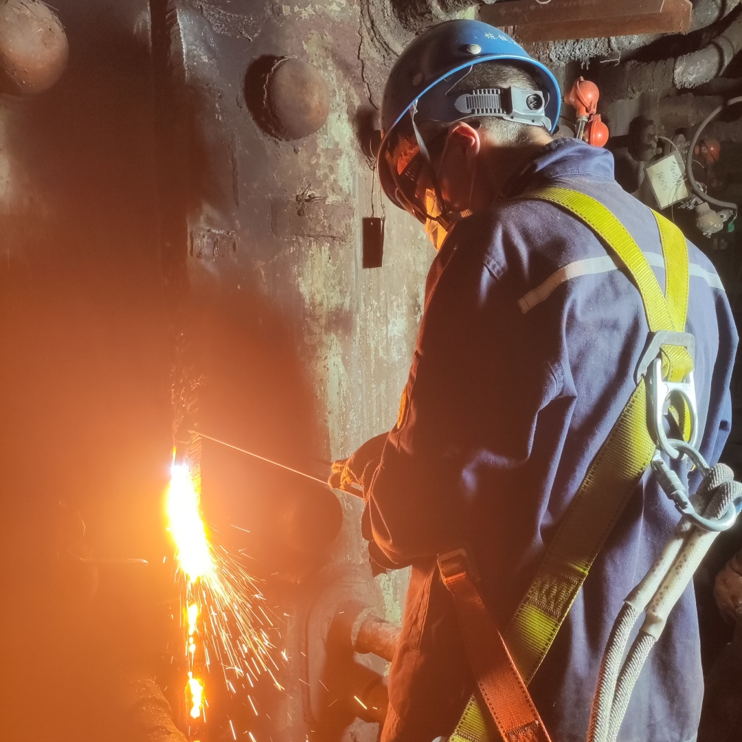 青年工匠陶康正和劉興勇、吳開強、余建兵、田均、陳渝5名焊工技師在一號高爐進行殘鐵口焊縫炸裂后的重新焊接,檢修位置極其狹窄,管道交錯。陶康他們系掛著安全帶一點一點細致焊接,全力保證著焊接質(zhì)量和工期。后據(jù)陶康介紹,原來的焊縫炸裂了2.3米,焊接位置溫度高,質(zhì)量要求極高,為有焊接必勝把握,團隊提前在操檢合一培訓(xùn)基地模擬現(xiàn)場焊接。在現(xiàn)場30多個小時里,他們輪番上陣,確保了檢修時按時按量的完成焊補任務(wù),最終節(jié)約維修費用26500元。