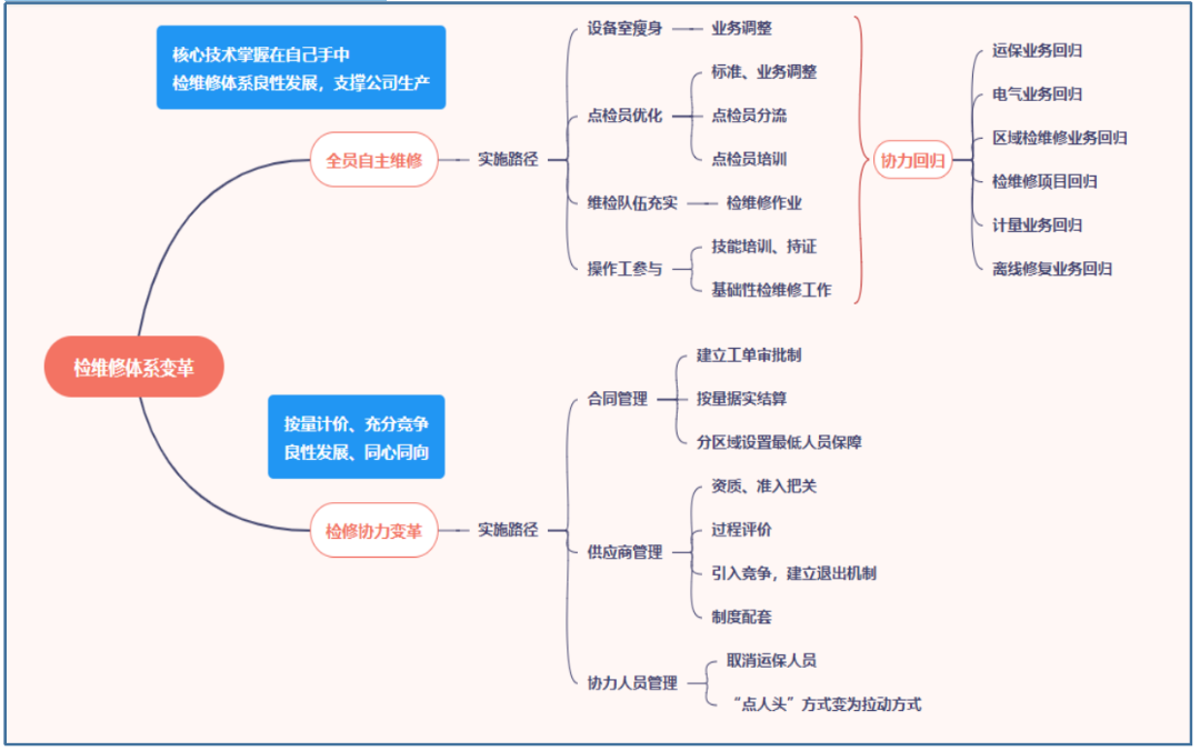 推進(jìn)全員自主維修,推進(jìn)檢修協(xié)力變革,同步鼓勵(lì)多種模式的配套檢修協(xié)力項(xiàng)目回歸。