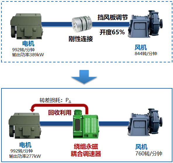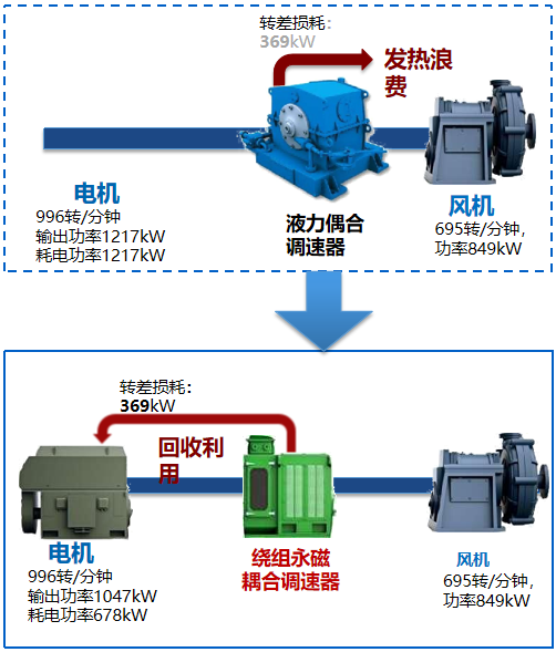 “江陰興澄特鋼二煉鐵1#、2#兩臺(tái)1000kW主排風(fēng)機(jī)改造項(xiàng)目”:使用繞組永磁調(diào)速器替換原有調(diào)速型液力偶合器改造,節(jié)電率為29%。